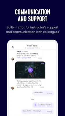 Participate in training courses. Complete assignments anywhere. Communicate with colleagues and instructors in chat. Keep track of the learning schedule. Give feedback about trainings.
